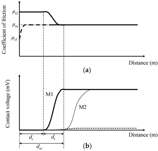 Schematics of (a) coefficient of friction and (b) contact voltage responses.