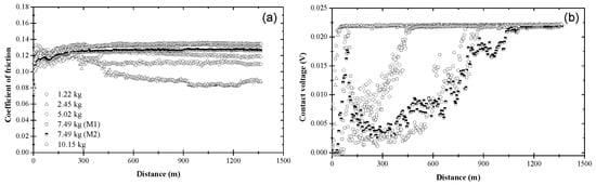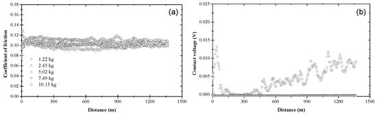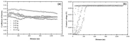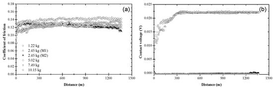 (a) Coefficient of friction and (b) contact voltage versus sliding distance and load for blend 5 (base oil + 0.1 wt% dispersant B).