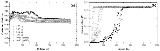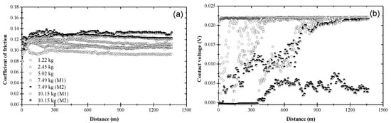 (a) Coefficient of friction and (b) contact voltage versus sliding distance and load for blend 1 (base oil).
