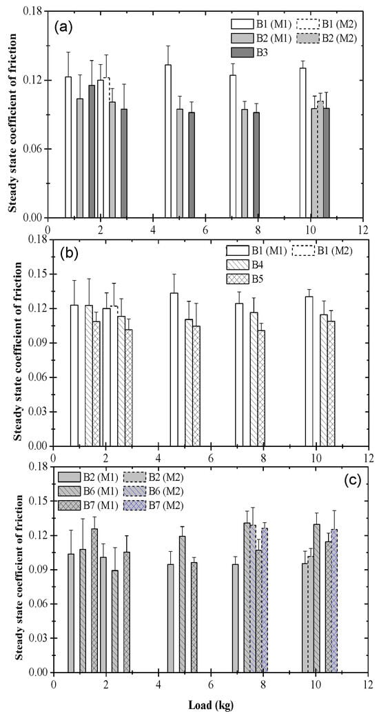 Steady-state coefficient of friction versus load for different blends: (a) B1 = blend 1 (base oil), B2 = blend 2 (base oil + 0.05 wt% ZDDP), and B3 = blend 3 (base oil + 0.08 wt% ZDDP); (b) B1 = blend 1 (base oil), B4 = blend 4 (base oil + 0.1 wt% dispersant A), and B5 = blend 5 (base oil + 0.1 wt% dispersant B); (c) B2 = blend 2 (base oil + 0.05 wt% ZDDP), B6 = blend 6 (base oil + 0.05 wt% ZDDP + 0.1 wt% dispersant A), and B7 = blend 7 (base oil + 0.05 wt% ZDDP + 0.1 wt% dispersant B). (M1 and M2 indicate bimodal behavior; error bars indicate one standard deviation above the mean value).