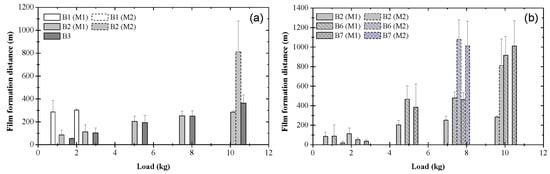 Film formation distance as a function of load for different blends: (a) B1 = blend 1 (base oil), B2 = blend 2 (base oil + 0.05 wt% ZDDP), and B3 = blend 3 (base oil + 0.08 wt% ZDDP); (b) B2 = blend 2 (base oil + 0.05 wt% ZDDP), B6 = blend 6 (base oil + 0.05 wt% ZDDP + 0.1 wt% dispersant A), and B7 = blend 7 (base oil + 0.05 wt% ZDDP + 0.1 wt% dispersant B). (M1 and M2 indicate bimodal behavior; error bars indicate one standard deviation above the mean value).