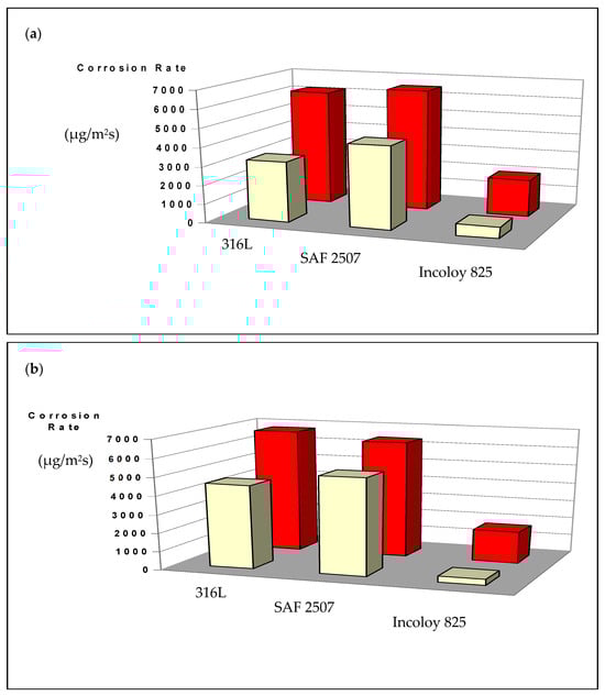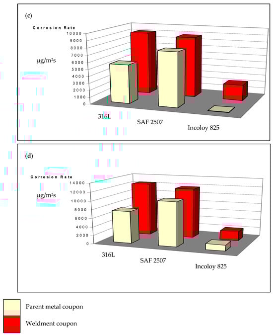 As shown in Figure 7, the corrosion rate of the parent metal (3.5 × 103 μg/m2 s) and weldment (6 × 103 μg/m2 s) of SAF 2507 were, respectively, similar to those of the 316L stainless steel in FeCl3 solutions with and without a nitrite addition; however, SAF 2507 showed a greater resistance to pitting (as shown in Figure 6). The corrosion resistance of both the parent metal (5 × 102 μg/m2 s) and the weldment (1.5 × 103 μg/m2 s) of Incoloy 825 was much lower (than the corresponding samples of SAF 2507/316L). For each alloy, the corrosion rate of the parent metal was lower in each environment, which may possibly be attributed to the greater pitting susceptibility of the HAZ in the weldment of each alloy (Figure 6).