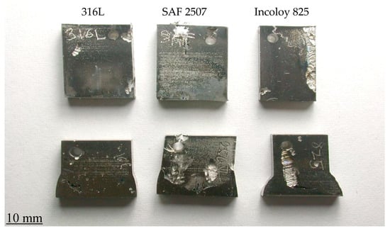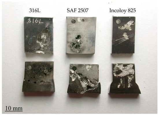 Appearance of coupons of parent metals and weldments of SAF 2507 and Incoloy 825 and 316L after exposure to a 6% FeCl3 solution (with 7872 ppm nitrite) at 50 °C for 72 h (Top row: parent metals; bottom row: weldments).