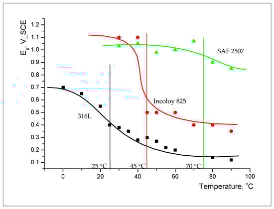 Figure 10 presents a plot of Ep vs. temperature for each alloy. A decrease in Ep with an increasing temperature identifies CPT. The following CPT of the alloys in 0.1 M NaCl were found: SAF 2507, 70 °C; Incoloy 825, 45 °C; and 316L, 25 °C.