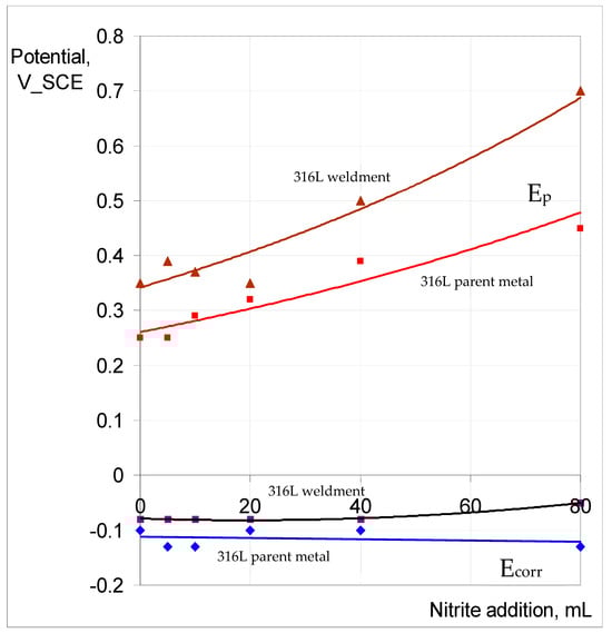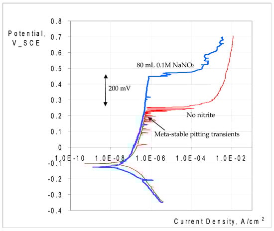 The passivation and pitting resistance characteristics of SAF 2507 first improved when increasing the nitrite content of the chloride solution and were compromised with a further increase in the nitrite content, and the trend is consistent with the reported literature []. The passivation and pitting resistance characteristics of 316L continued to improve with an increasing nitrite content of the chloride solution (Figure 14). Given the considerable difference in the pitting resistance of SAF and that of 316L, it seems it may require much higher nitrite content for the perturbance of the passivation to kick in.