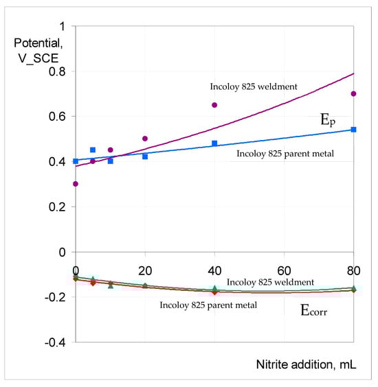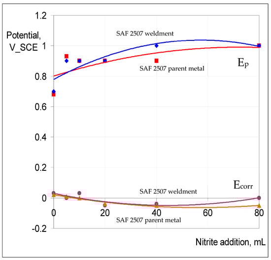 Figure 12 presents the summaries of the variation in Ep and Ecorr for the parent metal and weldment of SAF 2507 exposed to 0.1 M NaCl at 90 °C with increasing NaNO2 additions. Both the parent metal and weldment had similar Ep (~700 mV) in 0.1 M NaCl without nitrite, which was the highest Ep among the three alloys tested. The additions of 20 mL and 40 mL of 0.1 M NaNO2 appear to have had an inhibitive effect on pitting, whereas a further increase in the nitrite content (to 80 mL) seems to have compromised the pitting resistance. This behaviour is consistent with the reported literature [] in which the passivation characteristics of the duplex stainless steel in a chloride solution were found to improve, and Ep was found to increase with the increasing nitrite content of a chloride solution from 0–100 ppm, whereas a further increase to 1000 pm began to significantly perturb the passivation, and at a still higher concentration (2000 ppm), the passivation characteristics were remarkably perturbed.