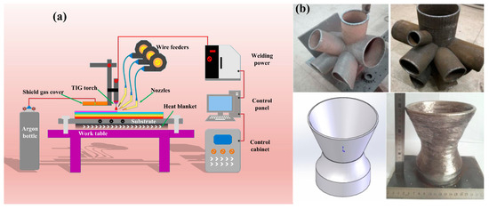 (a) Schematic diagram of the WAAM system; (b) a typical thin-walled part with geometrical features [25,26].