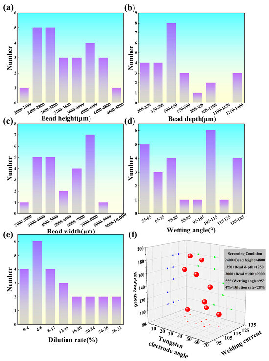 Figure 2 displays the variations in characteristic parameters of 308L thin-wall single-pass welds. The weld bead height, depth, width, and dilution rate of 308L stainless steel exhibited typical normal distributions, while the wetting angle followed a bimodal distribution pattern. This was because the wetting angle was significantly negatively correlated with dilution rate and height but unrelated to width. In practical applications, suitable process parameters can be chosen based on the characteristic parameters of 308L stainless steel, and a process parameter database can be established based on different characteristic parameter results, as shown in Figure 2f. For easy reading of the axes, they are shown in different colors on different mapping surfaces respectively. Since different materials have varying characteristic parameters, their process parameters also vary.