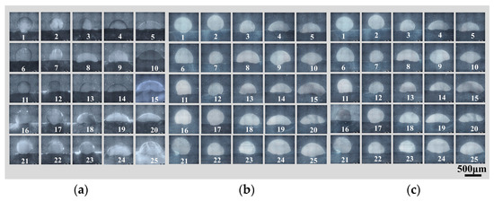 Figure 3 shows the macroscopic morphology of the 25 different combinations of single-pass, single-layer weld beads. Most of the specimens exhibited slight oxidation on the surface of the weld bead and in the heat-affected zone of the base metal. During the process, if the substrate temperature was relatively low before the first process layer transitioned to the base metal, the molten metal might not spread well on the substrate surface due to insufficient surface tension. Moreover, the welding speed and wire feeding speed are mismatched, resulting in intermittent point-like process layers and the inability to form a continuous process layer [27]. This morphology is shown in red in Figure 3 (samples numbered 6, 7, 11, 16, 21, 22, and 23). In such cases, due to the significant and discontinuous height variation of the weld bead, the beads were considered unsuitable for AM applications. Three metallographic samples were taken at different locations within each weld bead, and Figure 4 shows the corresponding cross-sectional metallographic images.