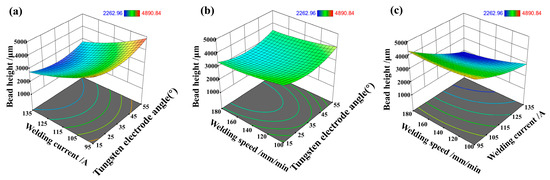 (a) The interaction effect of tungsten electrode angle and welding current on the melt height, (b) The interaction effect of tungsten electrode angle and welding speed on the melt height, (c) The interaction effect of welding speed angle and welding current on the melt height.
