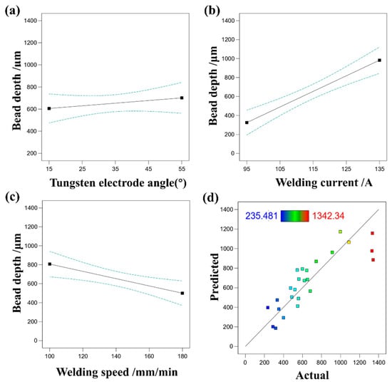 (a) The effect of tungsten electrode angle on bead depth, (b) the effect of welding current on bead depth, (c) the effect of welding speed on bead depth, (d) comparison of predicted and actual values of bead depth.