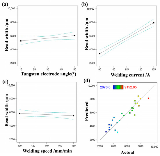 (a) The effect of tungsten electrode angle on bead width, (b) the effect of welding current on bead width, (c) the effect of welding speed on bead width, (d) comparison of predicted and actual values of bead width.