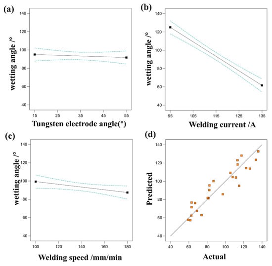 (a) The effect of tungsten electrode angle on wetting angle, (b) the effect of welding current on wetting angle, (c) the effect of welding speed on wetting angle, (d) comparison of predicted and actual values of wetting angle.