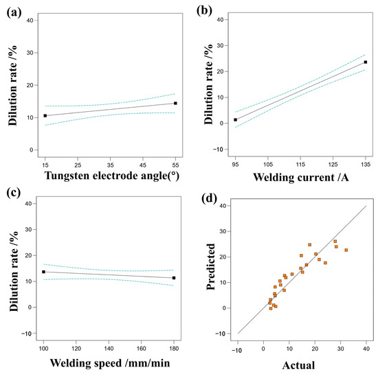 Figure 11 illustrates the impact of various single factors on the dilution ratio, along with a comparison between predicted values and actual responses. It is evident that welding current has the most significant influence on the dilution ratio, while welding speed and tungsten electrode angle have a relatively minor effect. By examining the relationship between predicted and actual dilution ratio values, the accuracy of the regression equation fitting can be assessed. Actual values are observed to be closely distributed near the diagonal line, indicating that the regression equation effectively captures the relationship between welding parameters and dilution ratio. Table 9, analyzed via RSM, reveals a model F-value of 31.80, signifying the model’s significance.