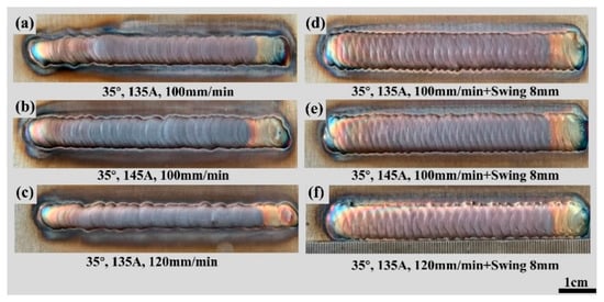 Shape of single-pass single-layer welds after parameter optimization and 8 mm swing: (a) 35°/135 A/100 mm/min, (b) 35°/145 A/100 mm/min, (c) 35°/135 A/120 mm/min, (d) 35°/135 A/100 mm/min + 8 mm swing, (e) 35°/145 A/100 mm/min + 8 mm swing, (f) 35°/135 A/120 mm/min + 8 mm swing.