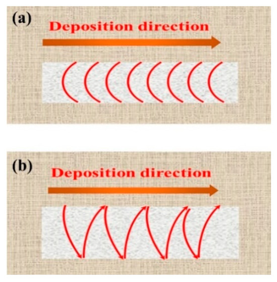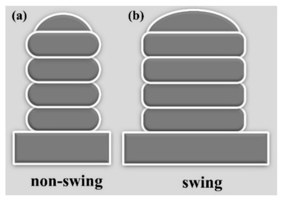 Here, region A corresponds to the area available for utilization within the cross-section, and region S corresponds to the total cross-sectional area. Figure 19 illustrates schematic diagrams of non-swing and swing portions. It is observed that a lower bead width-to-height ratio (i.e., the ratio of bead width to bead height) leads to higher surface waviness and lower process efficiency (Figure 19a), whereas a higher bead width-to-height ratio ensures closer adherence to the desired form and higher process efficiency (Figure 19b). Therefore, at a given wire feed rate, a higher bead length-to-diameter ratio results in better surface smoothness of the component and higher process efficiency.