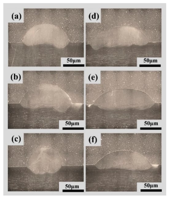 Cross-sectional view of the weld after parameter optimization and swing, (a) 35°/135 A/100 mm/min, (b) 35°/145 A/100 mm/min, (c) 35°/135 A/120 mm/min, (d) 35°/135 A/100 mm/min + 8 mm swing, (e) 35°/145 A/100 mm/min + 8 mm swing, (f) 35°/135 A/120 mm/min + 8 mm swing.