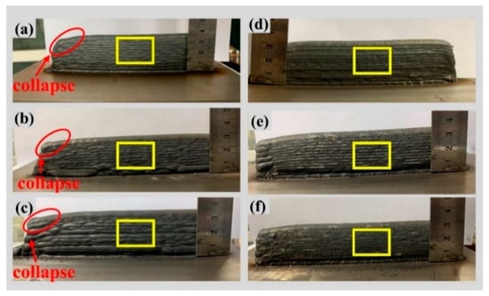 Macro morphology of single-pass multilayer wall forming after parameter optimization and swing, (a) 35°/135 A/100 mm/min, (b) 35°/145 A/100 mm/min, (c) 35°/135 A/120 mm/min, (d) 35°/135 A/100 mm/min + 8 mm swing, (e) 35°/145 A/100 mm/min + 8 mm swing, (f) 35°/135 A/120 mm/min + 8 mm swing.