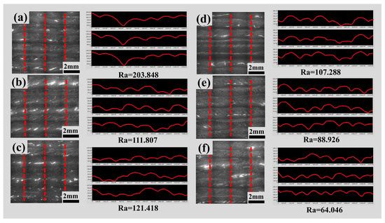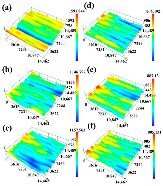 Local line roughness of single-pass multilayer walls after parameter optimization and swing, (a) 35°/135 A/100 mm/min, (b) 35°/145 A/100 mm/min, (c) 35°/135 A/120 mm/min, (d) 35°/135 A/100 mm/min + 8 mm swing, (e) 35°/145 A/100 mm/min + 8 mm swing, (f) 35°/135 A/120 mm/min + 8 mm swing.