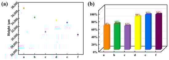 Height of single-pass multilayer wall after parameter optimization and swing (a) and forming efficiency (b), the figure caption (a–f) are respectively: (a) 35°/135 A/100 mm/min, (b) 35°/145 A/100 mm/min, (c) 35°/135 A/120 mm/min, (d) 35°/135 A/100 mm/min + 8 mm swing, (e) 35°/145 A/100 mm/min + 8 mm swing, (f) 35°/135 A/120 mm/min + 8 mm swing.