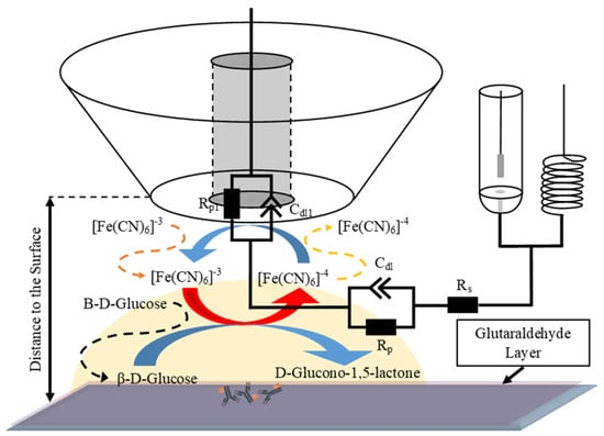 A schematic representation of the feedback mode for the electrochemical impedance microscopy measurements of the IgG-AuNP-modified surface in the presence of glucose and potassium ferrocyanide (K4[Fe(CN)6]), which serves as a redox mediator.