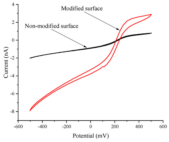 Cyclic voltammograms of modified and non-modified platinum ultramicroelectrodes (diameter—10 µm). Measurements were performed in a phosphate-buffered solution with the 1 mM K3[Fe(CN)6]/K4[Fe(CN)6] and 50 mM of glucose.