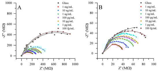 Nyquist plots observed at a 2 µm distance from the sample. (A). Non-modified platinum ultramicroelectrode; (B). Modified platinum ultramicroelectrode, near different concentrations of immobilised Ab-AuNP, starting from 1 mg/mL to 0 mg/mL. Measurements were performed in the phosphate-buffered solution with the 1 mM K3[Fe(CN)6]/K4[Fe(CN)6] and 50 mM glucose.