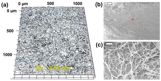 Figure 3 shows the surface image of the collagen coating. Figure 3a shows the 3D surface morphology of the collagen coating captured by 3D-LSCM, and Figure 3b,c show low- and high-magnification SEM images of the collagen coating, respectively. The collagen coating has a structure in which microscale collagen fibers formed using a protein solution extracted from rat tails are intricately entangled in a net shape [23]. From the three-dimensional surface morphology image taken through 3D-LSCM, it was confirmed that the average surface roughness of the collagen coating was approximately 3.53 μm. Through the SEM image enlarged with high magnification, it was confirmed that the inside of the collagen coating was randomly entangled with micro-scale thin collagen fibers in a network structure. The thickness of the collagen coating confirmed through SEM analysis of the cut side of the collagen-coated specimen was confirmed to be approximately 30 μm.
