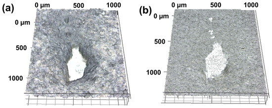 Damaged part on collagen coating (a) before and (b) after contacting with water.