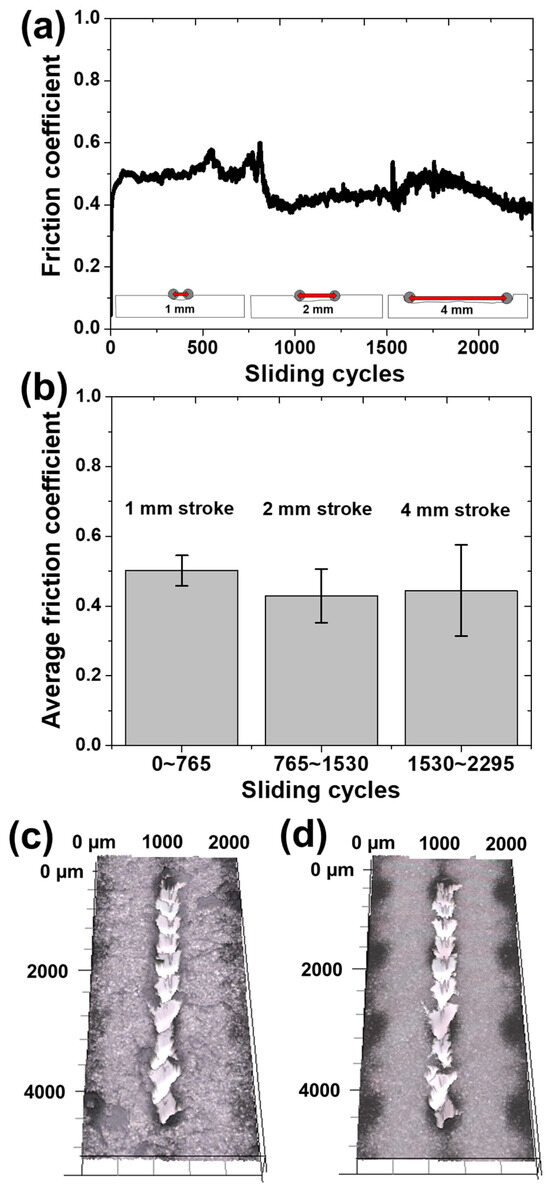 Variation in friction and wear characteristics of collagen coating with respect to the sliding stroke length. (a) Friction coefficient history and (b) average friction coefficient of collagen coating as a function of the number of sliding cycles for stroke lengths of 1 mm, 2 mm, and 4 mm. Confocal microscope images of wear track (c) before and (d) after contacting with water.