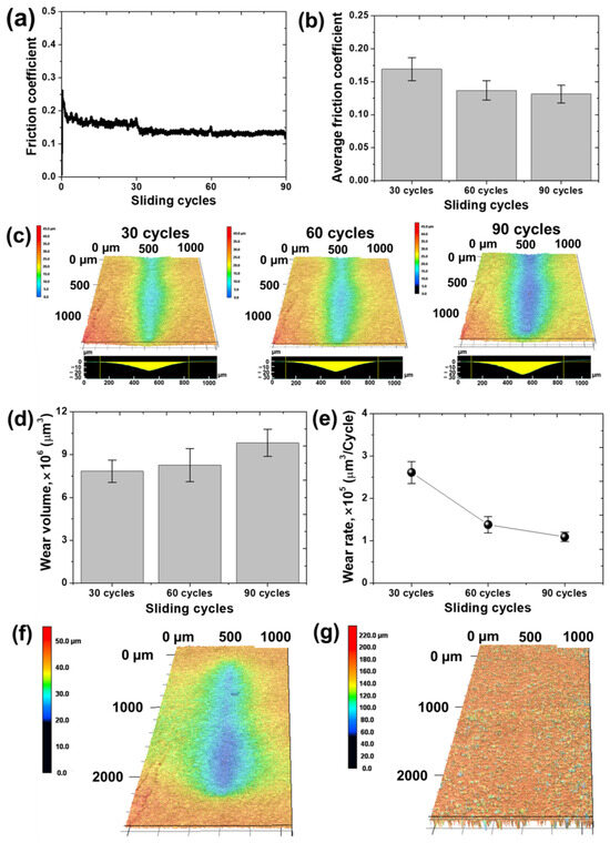 After applying a normal load of 20 mN to the collagen coating to further alleviate the contact pressure condition, a sliding friction motion was performed. In addition, in order to observe the formation process of the wear track in real time and perform the experiment only until the collagen fibers were completely broken, a friction test was performed with a custom-built tribotester mounted on the 3D-LSCM. The wear track formed on the surface of the collagen coating was observed every 30 cycles, and the change in friction coefficient was analyzed in real time, as shown in Figure 7a. When a normal load of 20 mN was applied, the initial sliding motion started with a friction coefficient of approximately 0.26. After dropping rapidly below 0.2, the friction coefficient was maintained at approximately 0.18 and then gradually decreased. After observing the wear track that formed on the collagen coating at the point of 30 cycles, an additional sliding friction motion was performed again for 30 cycles, and as a result, the friction coefficient was maintained at 0.14, and this value was maintained for a total of 90 cycles thereafter. Figure 7b–e show the average friction coefficient, 2D profile and 3D surface images of the wear track, wear volume and wear rate measured every 30 cycles of sliding motion, respectively. The average friction coefficient values measured for each 30, 60, and 90 cycles of sliding motion were 0.17, 0.14, and 0.13, respectively, and tended to decrease as the sliding cycle increased. The average friction coefficient in the entire experiment was approximately 0.15. In the case of the wear track measured every 30 cycles, the width and depth of the wear track increased as the sliding cycle increased, as shown in Figure 7c. As a result of calculating and measuring the wear volume through 2D profile image analysis of the wear track, we found that it was 7.85 × 106 μm3, 8.28 × 106 μm3, and 9.82 × 106 μm3 for 30, 60, and 90 cycles of sliding motion, respectively. As the sliding motion was repeated, it was a natural result that the amount of accumulated wear increased. However, when compared with the wear volume per cycle, that is, the wear rate, as the sliding cycle increased by 30 cycles, it was confirmed that the wear rate gradually decreased to 2.62 × 105 µm3/cycle, 1.38 × 105 µm3/cycle, and 1.09 × 105 µm3/cycle, respectively. This means that the rate of increase in the amount of wear was low compared to the increase in the number of sliding cycles. In the initial contact sliding motion, the collagen coating was compressed to form a wear track, but the collagen coating was not completely torn off within at least 90 cycles. This is to keep the amount of wear relatively small. However, when contact and sliding conditions became severe due to a further increase in the sliding cycle or an increase in the normal load, the collagen coating was completely peeled off and the amount of wear increased rapidly. After sliding for 90 cycles, it was found that the collagen fibers were much compressed from the measured width and depth of the wear track, and it was judged that further sliding would cause permanent damage to the collagen coating, so the experiment was stopped. Figure 7f shows a 3D image of the wear tracks with the wear tracks not completely peeled off. It showed the shape of a deep and wide wear track, and it can be seen that the wear track was deeply compressed over 20 μm. When water drops were dropped on the finally formed wear track, the deep and wide wear track completely disappeared and self-healed to a flat surface, as shown in Figure 7g. When the collagen fibers were not completely cut off, but only compressed, the collagen fibers absorbed water molecules and swelled to restore the compressed wear track area. The hypothesis was verified that when the contact pressure and sliding conditions were severe, the collagen fibers were broken and the self-healing effect disappeared as the coating was peeled off, and the self-healing effect appeared only when the collagen fibers were connected to each other.