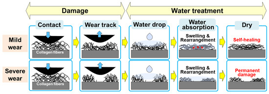 Figure 8 shows a schematic diagram explaining the mechanism of the self-healing effect according to the degree of damage of the collagen coating. In this study, when a normal load of 20 mN was applied and sliding motion was performed for 90 cycles, the collagen fibers in the collagen coating did not break and a mild wear track was formed in a compressed state, and the collagen fibers absorbed water molecules and swelled. As the collagen fibers were rearranged, a self-healing phenomenon occurred in which the wear track disappeared [29]. On the other hand, under severe contact and sliding conditions, such as when a normal load of 350 mN was applied and 2295 cycles of sliding motion were performed under a normal load of 30 mN, the collagen fibers were broken, the coating peeled off, and a severe wear track was formed. However, even in contact with water droplets, the swelling and realignment of collagen fibers were limited, so the wear tracks did not self-heal and permanent damage remained. Through this study, it was confirmed that in order to maintain the self-healing effect of the collagen coating, permanent damage resulting from breaking the collagen fibers should not occur. In addition, the normal load and sliding cycle conditions required for maintaining the connection without the breakage of the collagen fibers were identified.