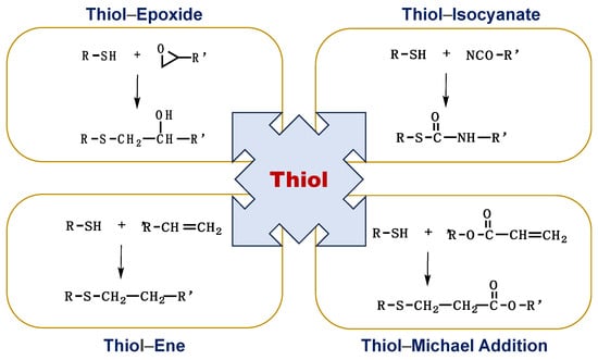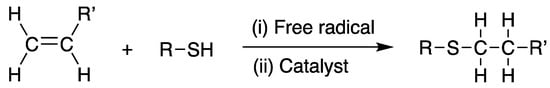 Thiols react via two mechanisms: radicals and nucleophiles [64]. A thiol radical addition includes a thiyl radical and can be initiated by heat or light [63,65,66,67]. The most important radical reaction is the thiol–ene addition reaction, which satisfies the criteria proposed by Sharpless et al. in 2001 and can be classified as a click reaction [68]. Another radical reaction is a thiol–yne addition reaction, allowing two thiols to bind to a triple bond [69,70].