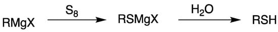 Thiols are synthesized by the reaction of the elemental sulfur with the Grignard reagent [53]. Organolithium compounds work similarly [54,55,56,57] (Scheme 8).