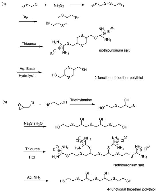 It is possible to synthesize a thioether polythiol, a polythiol compound containing a sulfide bond, for various purposes. A thioether polythiol containing three or more thiol functional groups can be prepared using a general polythiol synthesis method [80,81]. Normally, an alcohol- or halogen-containing sulfide reacts with thiourea to synthesize an isothiouronium salt. The thioether polythiol is acquired by the hydrolysis of this isothiouronium salt [82]. The general thioether polythiol synthesis method is shown in Scheme 10 [83,84,85,86].