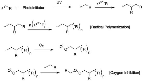 - Ligon, S.C.; Husár, B.; Wutzel, H.; Holman, R.; Liska, R. Strategies to reduce oxygen inhibition in photoinduced polymerization. Chem. Rev. 2014, 114, 557–589. [Google Scholar] [CrossRef]