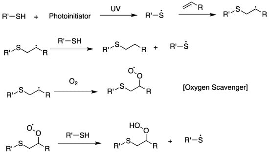 UV curing is an effective crosslinking method used in various applications, such as coatings, adhesives, printing inks, plastic lenses, optical fibers, dental materials, and wood composites [106,107,108,109,110]. The UV curing method is generally based on the free-radical polymerization of polyfunctional ene monomers and offers shorter reaction time, lower energy consumption, and lack of reliance on volatile organic solvents compared to conventional thermal curing and solvent-based lacquer methods. Although the UV curing method has been widely used, it also has limitations. Among them, oxygen inhibition is the most important obstacle of the UV curing method (Scheme 13). Oxygen forms peroxide radicals in the initiation and growth reactions in the free-radical polymerization reaction and lowers the curing density by lowering the reactivity of the free-radical polymerization [91,111,112]. Currently, the best way to solve this problem is to proceed with UV curing in an inert gas (nitrogen, argon, etc.) atmosphere, or use a large amount of a photoinitiator. In addition, it results in significant volumetric shrinkage and internal stress because gel points reflect a transition generally observed at low cure yields [63]. However, the photopolymerization of polythiol and ene (thiol–ene click reaction) is an effective method for rapidly producing films and cured products with excellent physical and mechanical properties, as shown in Scheme 14 [63,64,113,114,115,116,117,118]. As ene and thiol react stepwise via an exceedingly fast chain transfer reaction, the curing mechanism differs from the general UV curing mechanism [103,119,120]. This reaction includes adding a thiyl radical to the carbon of the ene functional group, generating a thiyl radical due to hydrogen abstraction to the thiol group by a radical of a carbon–carbon double bond. The growth and chain transfer reactions can be explained using the basic thiol–ene polymerization reaction mechanism, and finally, the termination reaction occurs owing to the radical–radical coupling reaction. The thiol–ene click reaction shows similar reaction rates in inert gas and air. Since the thiol group reacts with the peroxide radical and forms a highly reactive thiyl radical after hydrogen abstraction due to the peroxide radical, the oxygen inhibition problem can be addressed [111,121]. In addition, direct UV irradiation can induce a reaction without a photoinitiator [122]. The thiol–ene system can exhibit an intrinsically fast reaction rate [119], low polymerization shrinkage [114], and the formation of a uniform polymer structure. Therefore, thiol–ene photopolymerization has recently been commercialized and widely studied in many fields, such as clear coatings, inks, adhesives, negative photoresists, and optical materials [123,124]. Almost all types of ene compounds, including acrylates, vinyl ethers, allyl ethers, vinyl esters, and alkenes, can react efficiently with polythiols [66,98,125]. As the effect of polythiol and ene structure on the overall rate of the thiol–ene addition reaction have been studied extensively, it is possible to select various materials with a combination of characteristics necessary for a specific application [63,126].