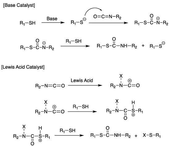 Polythiourethane lenses involve aromatic or aliphatic isocyanates, thioether polythiols, and ester polythiols individually or in combination [152,153]. They can be manufactured via the curing of a mixture of polythiol, isocyanate, and organotin (Lewis acid) catalyst under a programmed temperature increase [154,155]. The reaction can be activated by a basic or a Lewis acid catalyst, as shown in Scheme 15 [156]. Depending on the characteristic of the catalyst used, the activation occurs in two ways. If a basic catalyst is used, it activates the thiol by forming a nucleophilic activated anion, a species that attacks the isocyanate carbon [157]. If a Lewis acid is used as a catalyst, the coordination occurs with an isolated pair of oxygen or nitrogen (electrophilic activation) of the isocyanate that can be attacked by less nucleophilic substances, such as neutral thiols [154,158]. In general, thiols are more acidic than alcohols, and basic catalysts help form thiolate anions, which demonstrate higher nucleophilic properties than alkoxides. That is, the reactivity of thiols is higher than that of alcohols, so the thiol attack on isocyanates is much faster. However, a basic catalyst is not used in the manufacturing of highly refractive lenses because of its rapid reactivity, bubble generation, and lens appearance problems due to lack of uniformity of the cured specimen. In general, an organotin (Lewis acid) catalyst leading to a mild reaction is used in industrial highly refractive lens manufacturing.
