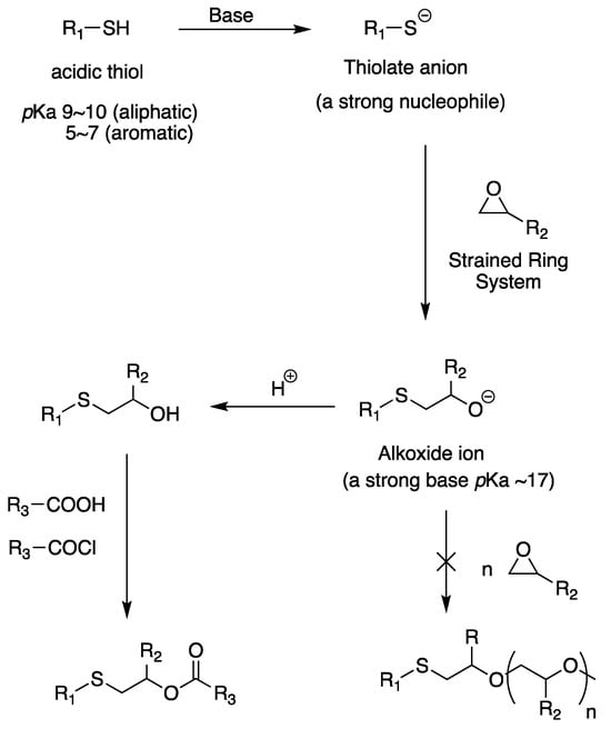 Recently, it has been used to prepare a well-defined polymer with a desired structure or introduce a functional group for modification after polymerization. In some cases, the secondary alcohol produced is less reactive than the primary alcohol, but it is still available for the reaction, and its modification to produce polyfunctional compounds is being investigated. The chemical reaction mechanism of the polythiol–epoxy reaction is yet to be examined. The ring modification of the epoxide functional group makes the molecule vulnerable to nucleophilic attack to restore the ideal tetrahedral angle at every atom. Among various nucleophiles, polythiol must be converted into a thiolate anion to exist as a nucleophile that can participate in a ring-opening reaction. This is possible using a suitable base that can effectively deprotonate the thiol group of the polythiol. For example, hydroxide anions can deprotonate the thiol groups of polythiols. There is no competition between hydroxide and thiol because thiols are more acidic than alcohols considering an attack on the epoxide ring (the pKa value of thiol is 5–10, which is lower than the pKa value of alcohol, 15.7) [168,169]. Therefore, a rapid proton transfer from sulfur to oxygen occurs, and formed thiolate attacks the side with relatively little steric hindrance in the epoxide unit. Thus, an alkoxide unit is formed, and its stabilization to a secondary alcohol is shown in Scheme 16. The reaction medium is typically moistened with water or has a protic nature in the curing system. Because thiol molecules are acidic, alkoxide units are protonated to high basicity (pKa = 17) [170].