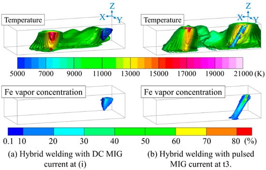For example, in the case of TIGW of stainless steel SUS304 at 150 A, the iron vapor concentration near the center of the weld pool is about 7% when helium gas is used and about 0.2% when argon gas is used [37]. Particularly, in the former case, it was shown that the current density of the plasma was greatly reduced, decreasing the penetration depth.