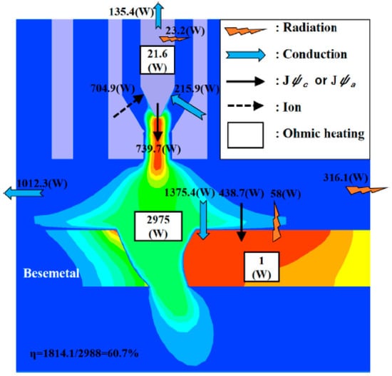 Wu et al. studied the energy balance in KPAW [62,63]. The energy transport among the electrode, plasma arc, and base metal was numerically evaluated using the coupled electrode-arc-keyhole-weld pool model applying the pre-fixed keyhole. Figure 3 shows the energy balance in the KPAW process of steel plate [62]. Thermal efficiencies of the PAW process with and without keyhole were also compared. In the case with a keyhole, both the energy consumption by arc and the energy input increase. On the other hand, the total energy transport from the arc to the weld pool slightly decreases, thus the thermal efficiency decreases. The open keyhole formation suppresses the energy transport to the weld pool, and 11.5% of the arc energy was lost by the efflux plasma. The calculated thermal efficiency is only 60.7% [62]. The thermal efficiency of KPAW was found to be relatively lower than those of GTAW and GMAW processes. Tanaka et al. presented the thermal efficiency of 82% in the GTAW process [41]. Joseph et al. experimentally obtained a thermal efficiency of 68–72% in the pulsed GMAW process through liquid nitrogen calorimetry [64].