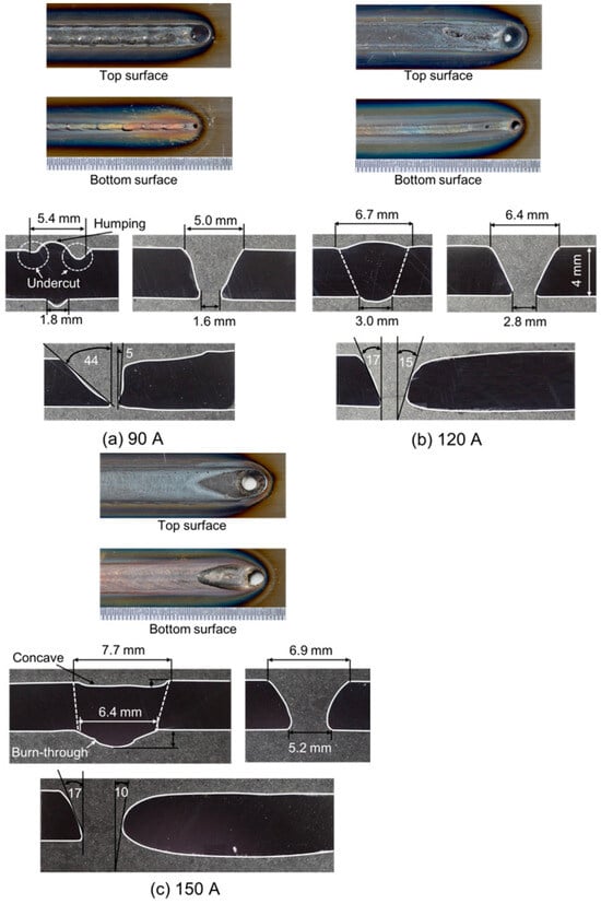Figure 5 shows the effect of current on the keyhole shape [68]. An open keyhole is formed at all current conditions. At 90 A, the diameter of the bottom keyhole is slightly small with a value of 1.6 mm; but, at 120 A, it expands to 2.8 mm, and at 150 A, it reaches 5.2 mm. At 150 A, the angle of the keyhole wall behind the keyhole is smaller than that at 120 A. In addition, the weld pool width increases with the current. When the current is increased, the amount of heat input is increased, and the electromagnetic force applied to the plasma arc is strengthened, so the arc pressure is also increased. It can be seen that the result at 90 A shows humping on the top surface and that at 150 A shows burn-through on the bottom surface. A sound weld bead is obtained only at 120 A.