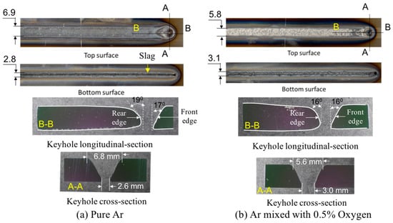 Figure 6 shows the effect of oxygen concentration in the shielding gas on the keyhole shape [69]. Here, a small amount of oxygen is mixed in the shielding gas, assuming shielding failure. The addition of 0.5% oxygen to the argon shielding gas increases the diameter of the bottom keyhole and decreases the angle of the keyhole wall behind the keyhole. This is probably because the surface tension of the weld pool decreased due to the absorption of oxygen into the weld pool.