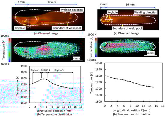 Figure 7 shows weld pool images and 2D temperature fields on the top and bottom surfaces. On the top weld pool surface, the temperature was measured to be between 1718 K and 1795 K. The weld pool is divided into regions 1–3, according to the difference in temperature. The temperature reached 1795 K in region 2. On the bottom weld pool surface, the temperature was distributed between 1714 K and 1794 K. The temperature monotonically decreased from 1794 K around the keyhole to 1714 K at the weld pool end.