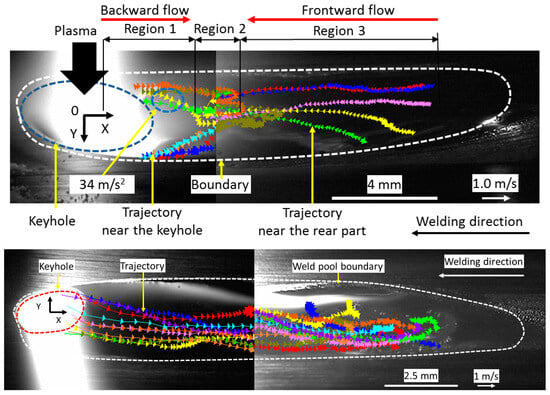 Figure 8 shows 2D convective patterns on the top and bottom weld pool surfaces. On the top weld pool surface, the definition of each region is the same as that in Figure 7. In region 1, molten metal flowed from the keyhole to region 2 at a high temperature. It also flowed inward from the weld pool edge to the center of the weld pool. In region 3, the molten metal flowed in a forward direction from the weld pool end to region 2 at a high temperature. In region 2, the molten metal flows from regions 1 and 3 were merged. Zirconia particles were rotated due to this convective pattern. On the bottom weld pool surface, the molten metal flowed backward to the weld pool end. The maximum velocities of 0.53 m/s and 0.81 m/s were seen at X = 2.0 mm on the top surface and X = 1.0 mm on the bottom surface, respectively.