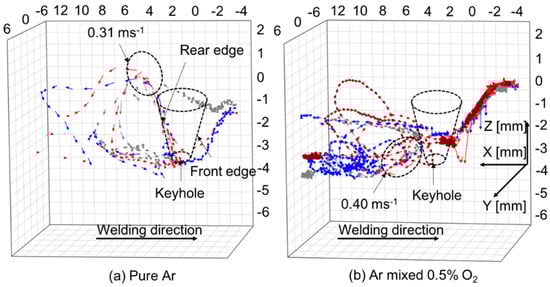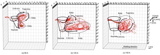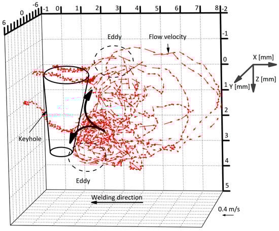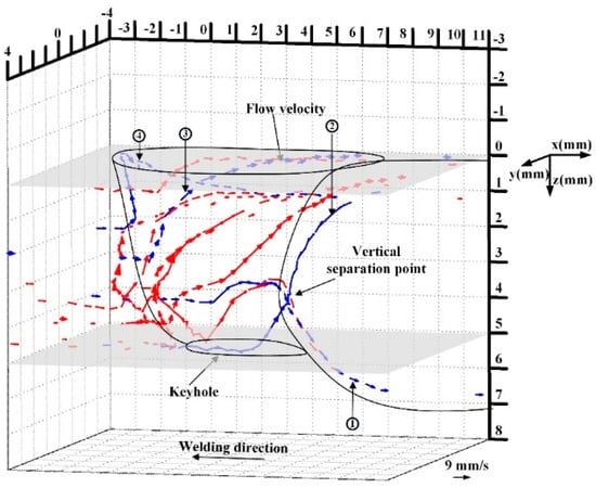Xu et al. clarified the 3D keyhole detouring the flow inside the weld pool in VPPAW of an aluminum alloy employing two sets of X-ray transmission systems [75]. Furthermore, measurement of the surface flow of the weld pool at different regions of the keyhole was also carried out by observing tracers. As a result, it was shown that a thin liquid metal layer was formed on the keyhole boundary because of the high thermal conductivity of the aluminum alloy. Moreover, the liquid metal was mainly formed around the keyhole bottom. Figure 10 shows 3D convective patterns in the weld pool. The liquid metal flowed upward and around the keyhole. The molten metal at the front wall of the keyhole around bottom detoured the keyhole backward. After that, it was blanched into upward and downward flows, forming a vertical separation point. In addition, comparing with the stainless steel case [74], the flow velocity of VPPAW was found to be much smaller.