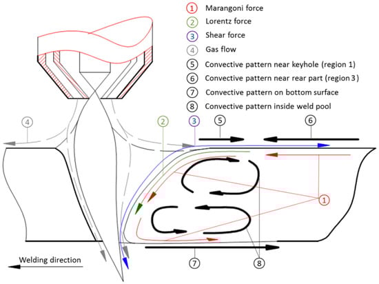 Schematic illustration of the main driving forces and convective patterns of the weld pool [74].