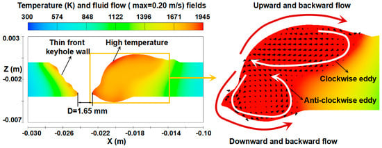 Figure 9 shows 3D convective patterns in the weld pool. The result showed that two eddy convective patterns in opposite directions were stably formed in the weld pool behind the keyhole. The maximum velocities for the molten metal flows near the top and bottom surfaces reached 0.35 and 0.30 m/s, respectively. The velocity of molten metal flow around the middle height decreased to 0.15 m/s.
