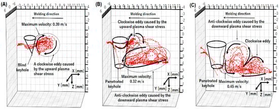 First, the plasma arc characteristics of PAW are described. As mentioned in Section 1, PAW generates a plasma arc via electric discharge between the tungsten electrode and the base metal. The current density is increased by contracting the plasma arc with a water-cooled copper nozzle mounted directly under the tungsten electrode. This increase in current density enhances the Lorentz force to accelerate the plasma arc jet from the tungsten electrode to the base metal. At the same time, strong Joule heating occurs and the plasma arc becomes extremely high temperature, especially near the nozzle. The high heat flux brought by the constricted plasma arc starts to melt the base metal, and the molten metal is pushed down by the arc pressure to form a keyhole. As described later, it is considered that the keyhole shape is determined mainly depending on the arc pressure field. When the open keyhole is formed, the plasma arc jet flowing from the electrode side branches in the keyhole. A part of this passes through the keyhole exit and flows down to the bottom side to become efflux plasma, the rest flows outward along the keyhole wall on the top side [29]. Both impose a strong shear force on the surface of the weld pool and are considered to be the main driving force of the weld pool convection in KPAW.