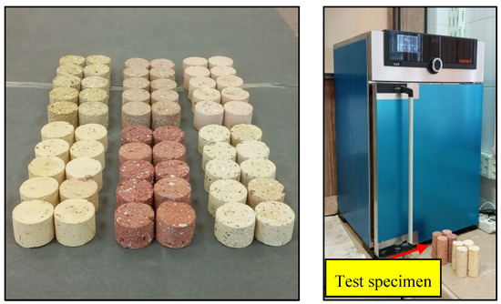 For each brick sample, two series of ten specimens were prepared, the first series for dry conditions and the second series for saturated conditions. The specimens were tested to determine their UCS following the method suggested by the ISRM [29]. Tests were performed on specimens with a diameter of 44 mm and a length-to-diameter ratio of 2. Some of the specimens used for the UCS tests are shown in Figure 4. Using the UCS device, loading was gradually applied to the specimens such that, finally, failure occurred in them. After recording the failure load (Pf) and using the diameter of the specimen (D), the UCS was calculated from the following equation: